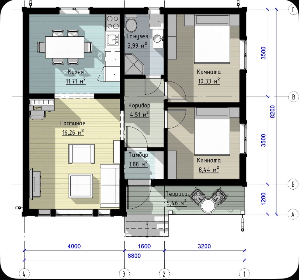 • Характеристики каркасного дома "Папай" 72 м2